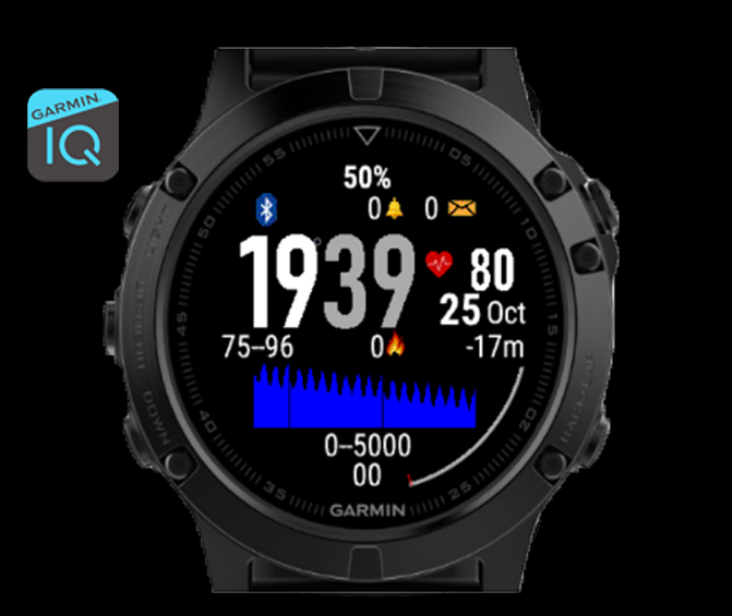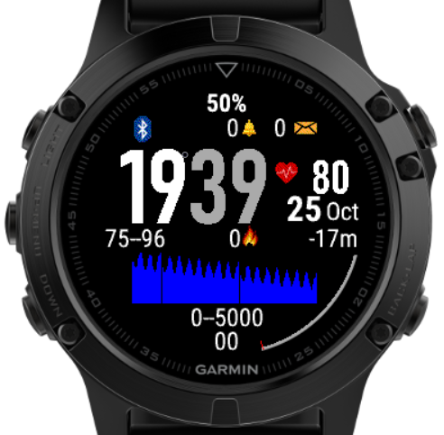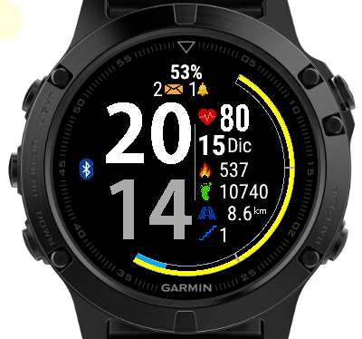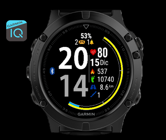 Watchface para relojes Garmin con grafica de actividad y parámetros útiles del día a día.