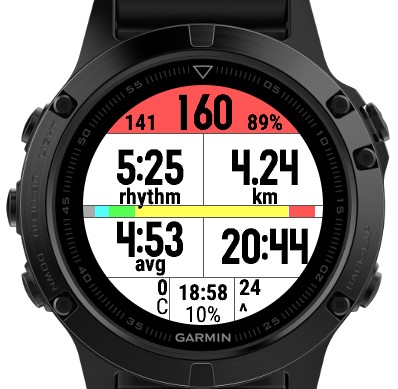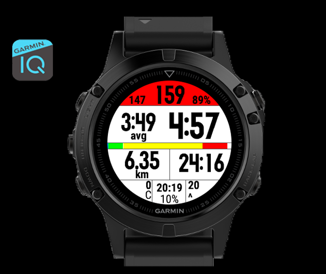 Campo de datos para reloj Garmin indicado para carrera continua con gráfica de zonas cardiacas.